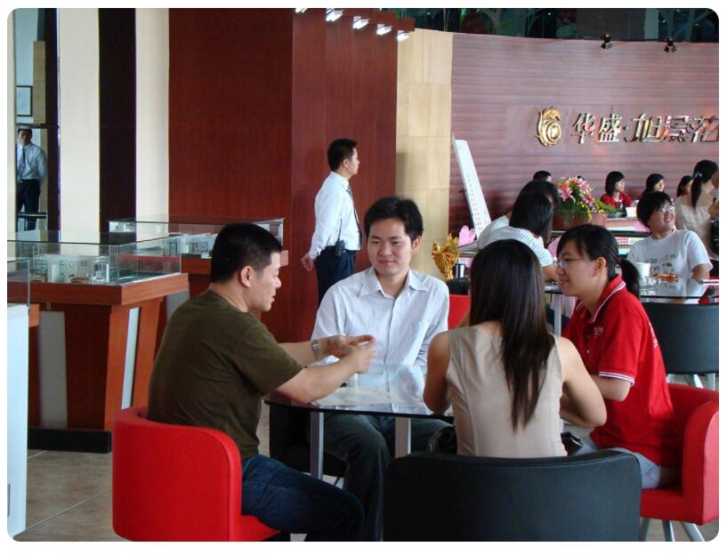 开盘当日,前期成功预约的多位客户蜂拥而至,加上慕名而来的各位购房意向者,挤满了售楼中心。售楼中心的楼盘模型、咨询台、领取资料处周围都围满了人,场面非常壮观。每张洽谈桌上都放有户型资料,置业计划书,销售人员在客户一旁作详细的介绍,为客户量身选房、计算价格。吧台旁边还摆放有各式的点心蛋糕和水果等供客人享用。