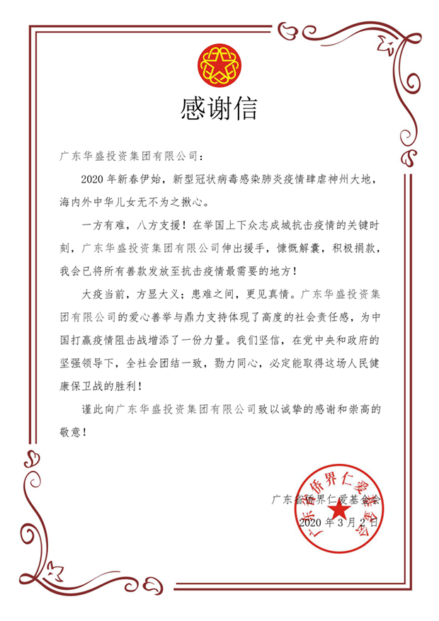 近日。新型冠状病毒感染肺炎。引发的疫情牵动着每个中华儿女的心。2020年1月27日,广东省侨联和广东省侨界仁爱基金会发出驰援抗击疫情的倡议,集团董事长郑继坤先生、总经理郑林栋先生即以广东爱游戏平台_爱游戏(中国)一站式服务平台集团设立的“侨爱南粤·添一基金”名义捐赠10万元,助力抗击疫情,表达企业应有的社会责任。